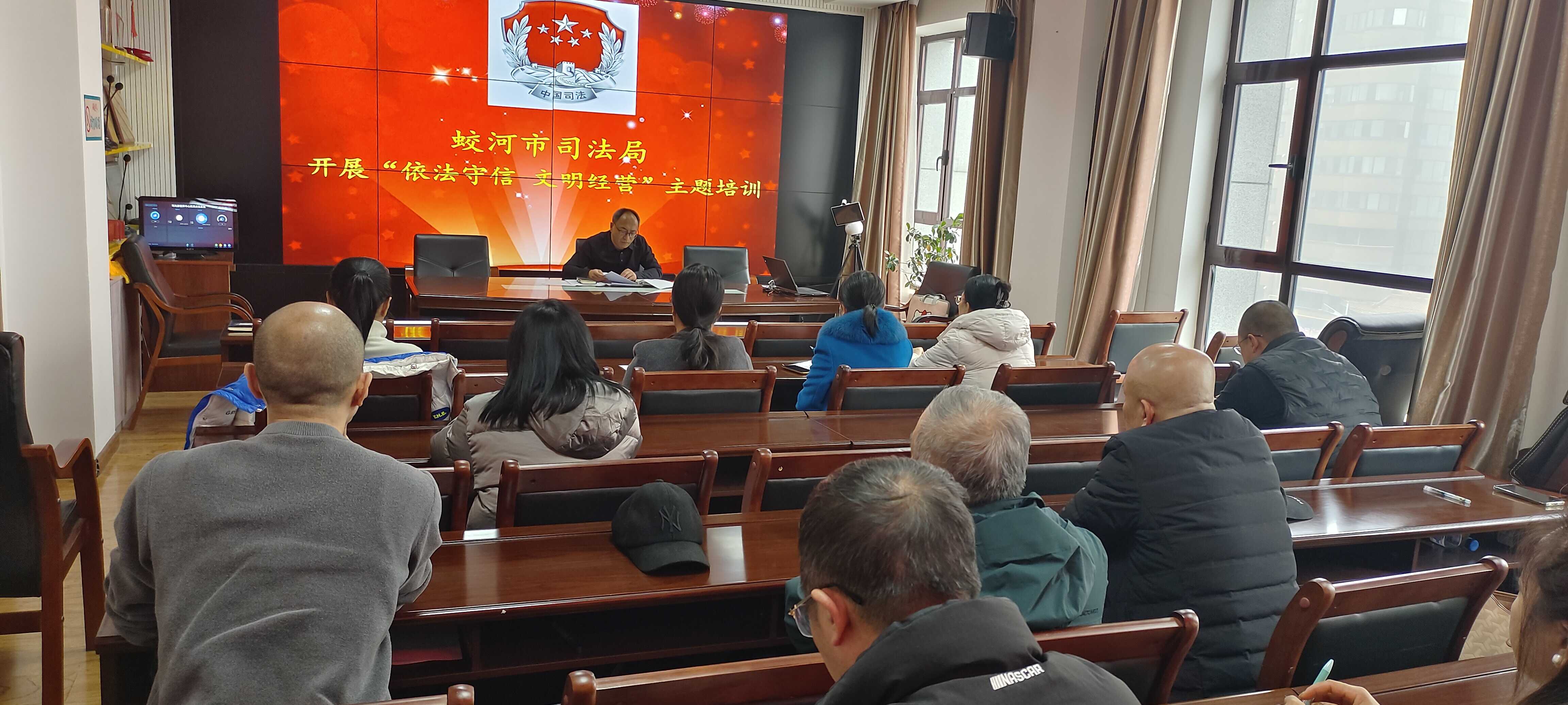 近日,蛟河市司法局副局长刘青武在局会议室主持召开全市法律服务行业“依法守信、文明经营”主题培训活动。全市各律师事务所、法律服务所及行管法律咨询机构相关负责人参加培训。